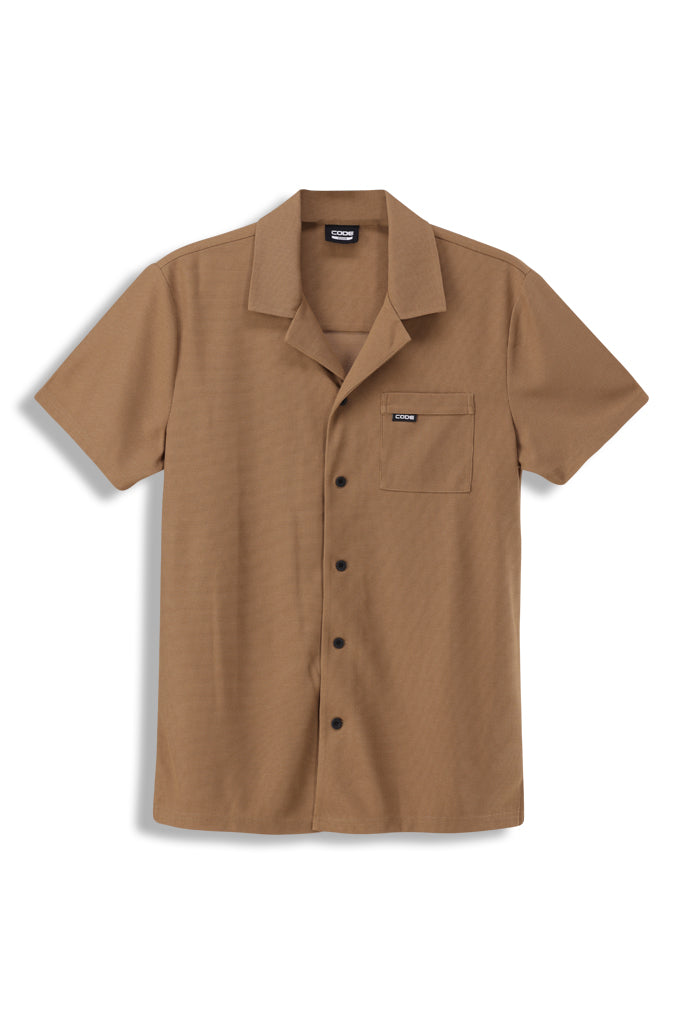 Coffee knit shirt bringing the chill vibes. Short sleeve, cotton-viscose blend, all-over print for that laid-back but smart-casual look. Button closure and branded trims keep it clean and easy.