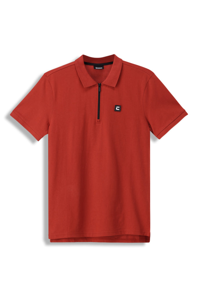 Red ochre zipper golfer that demands attention. 1/4 zip and rib-knit collar bring a fresh edge, while the bold color-block design makes it stand out. 100% cotton, HD branding—it’s all about that slim-fit confidence.